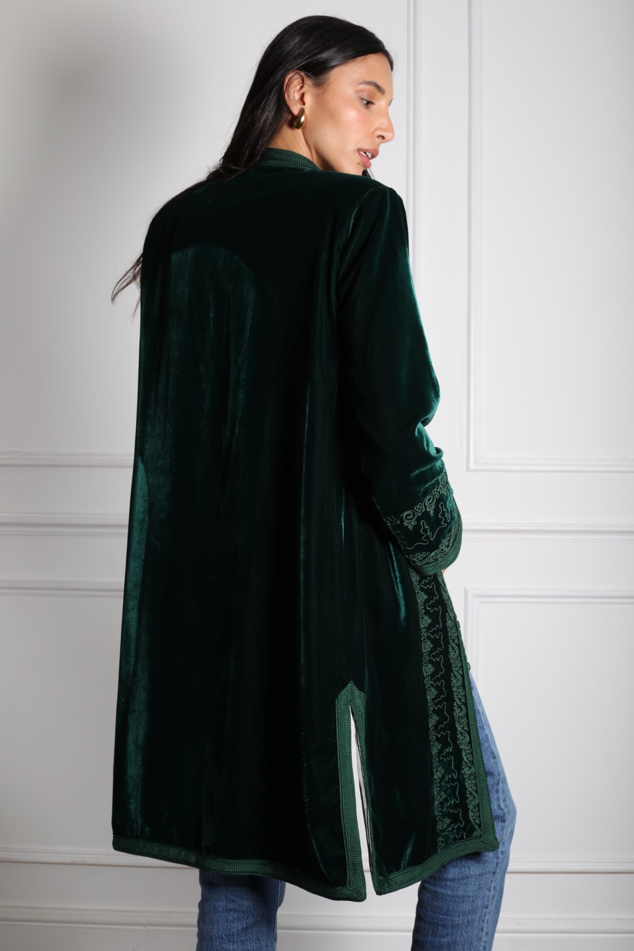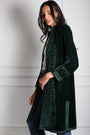 Inspired by the spirited allure of Pigalle, one of Paris’s most iconic and eclectic districts, this mid-length jacket in deep emerald velvet is a true standout. Embellished with fine silk embroidery that runs along the sleeves and down the front, every detail reflects a story of craftsmanship and quiet luxury.